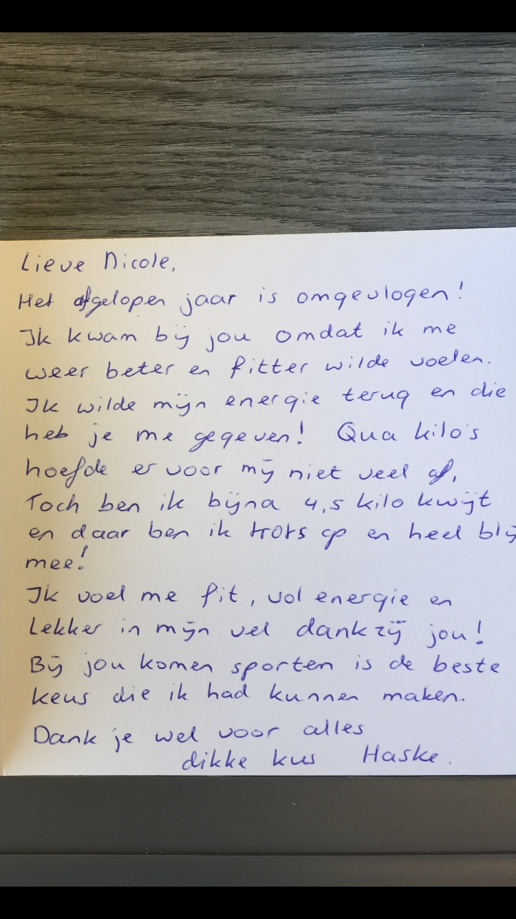 Ze heeft een jaar lang heel goed haar best gedaan en volgde mijn adviezen precies op. Haske is maar liefst 4,5 kilo afgevallen en voelt zich fit, ze is veel sterker geworden, zit strakker in haar lichaam en heeft veel meer energie dan voorheen.