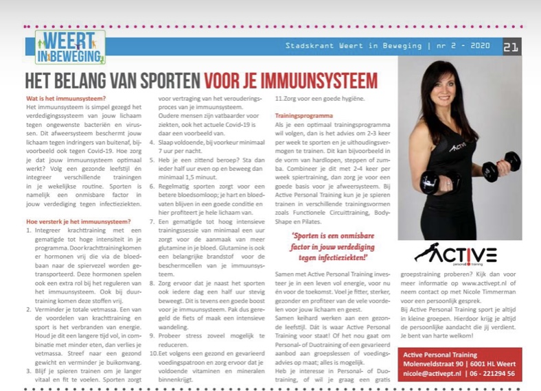 Active Personal Training staat ook dit najaar weer in De Stadskrant “Weert in Beweging”. Deze keer besteden we aandacht aan het belang van sporten voor je immuunsysteem.