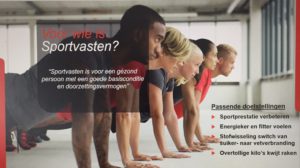 Sportvasten is een wetenschappelijk bewezen effectieve trainingsmethode om uw leven een nieuwe impuls (fitter, energieker) te geven en om een gezond gewicht te bereiken en te behouden. Sportvasten is geen dieet. Het is een 10-daagse trainingsmethode waarbij de spieren en de lever worden getraind in het verbruik van vet in plaats van suiker (de metabolic switch). Om dit te bewerkstelligen gaat u sporten tijdens de vastenkuur. Hierdoor gaat u meer vet verbranden en nemen overtollige vetreserves, met name het buikvet, af. Mannen vallen gemiddeld 4 tot 6 kilogram af in 10 dagen, vrouwen 2 tot 4 kilogram. Ook wordt de behoefte aan snaaien en het tussendoor snoepen na de kuur veel minder. Sportvasten is een gezondheidsprogramma, waarbij gewichtsverlies eigenlijk een bij-effect is.